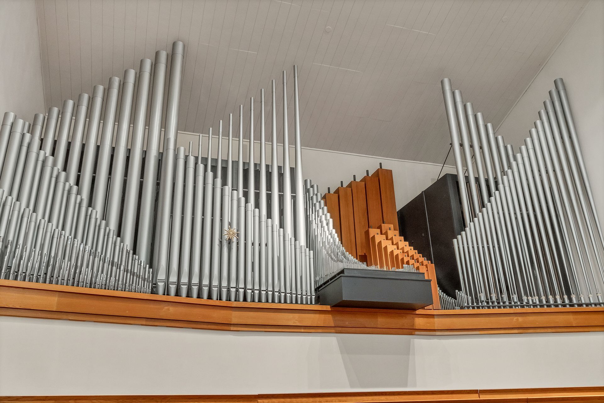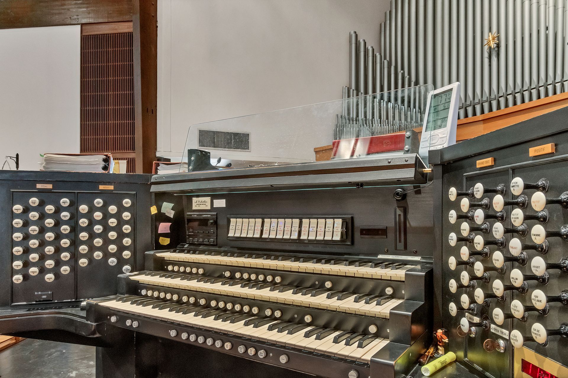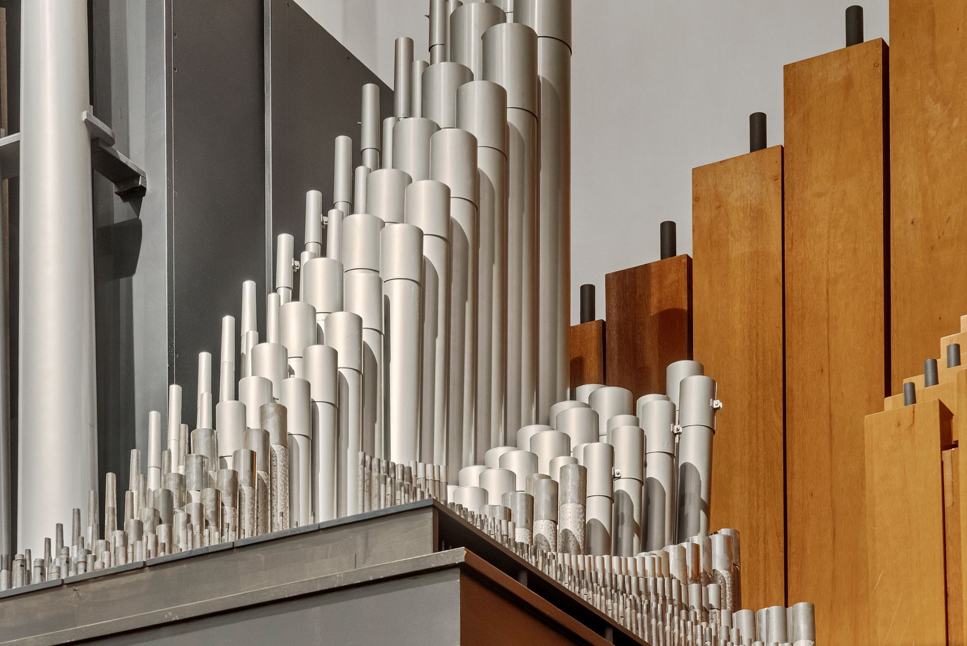 Though un-encased, the organ within this unusual hexagonal shaped church is ideally sited in a wide, shallow loft whose angled side walls and an upwardly sloping ceiling lend excellent projection of tone into the reverberant church. In such an environment, it was possible to revoice the principal choruses in a strong, classical manner, in which the pipes of any given pitch are voiced at much the same power. Flutes and strings were similarly emboldened, yielding more interesting timbres and greater melodic intensity. Merely re-regulated, the fine Gallic sounding chorus reeds remained much as before. The en-chamade trumpet was left virtually untouched as a heroic solo reed and as a testament to the abilities and ideals of Möller’s renowned reed voicer, Adolf Zajic.