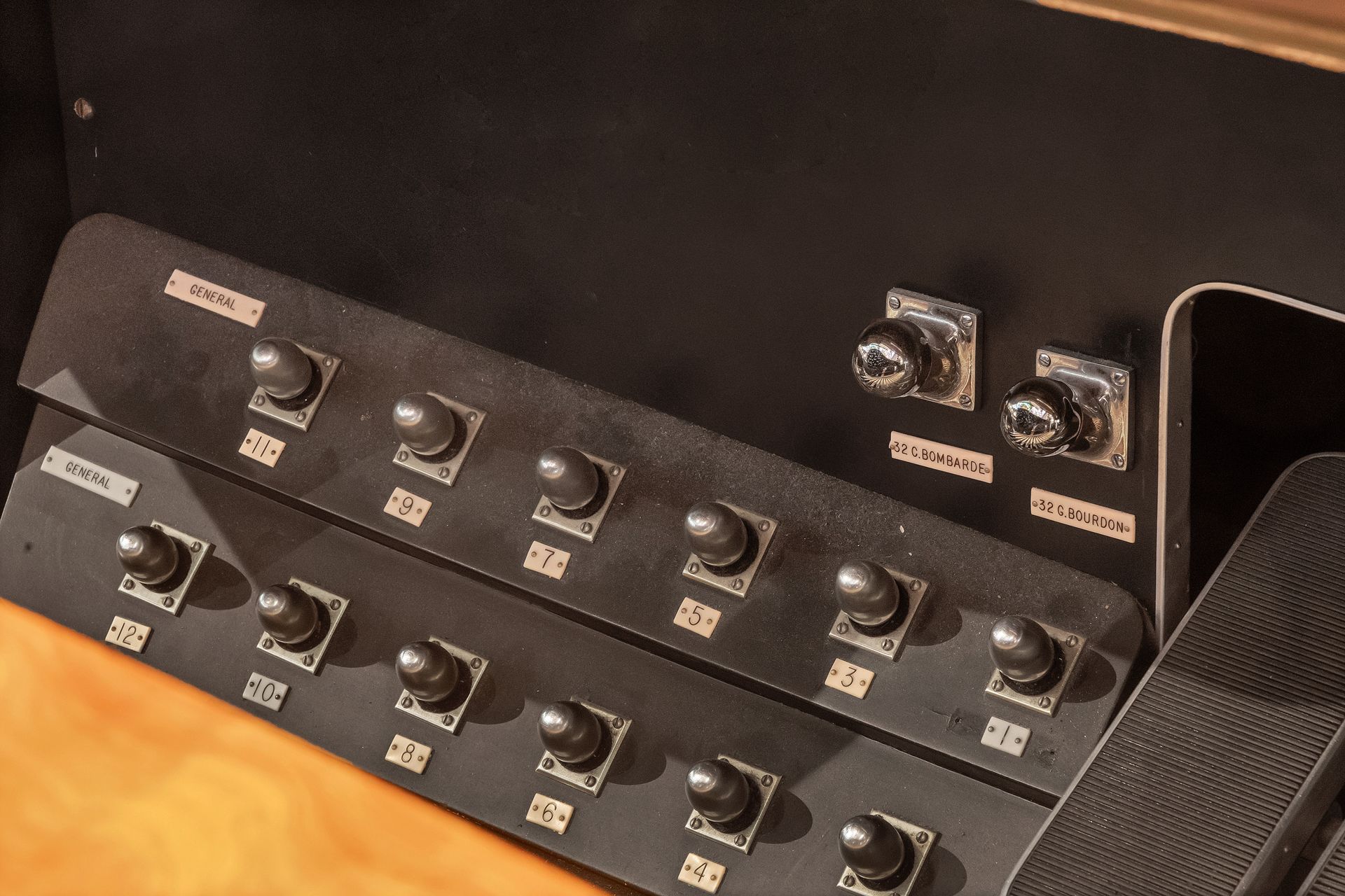 Part of the challenge in the revoicing came in attempting to provide ways around some of the unusual gaps in the specification. While luxuriously equipped with an en-chamade reed, two 32’ stops and three sets of Celestes, more basic registers (Grand 2½’ and 2’, Hautbois, Flûte harmonique) were lacking. A carefully balanced tonal structure, both within stops and between divisions was the first step in addressing musical demands. Other refinements, particularly in the re-balancing of the color reeds and the 4’ Flutes, allowed for example, the Hautbois tone to be simulated through unusual combinations. Finally, two minor tonal changes overcame what voicing alone could not: recomposing the Grand Mixture one-half octave lower for better cohesion; and deriving an octave tierce out of the former carillon mixture, to give a truer sesquialtera voice (played an octave lower) than either of the alternative cornet registrations.